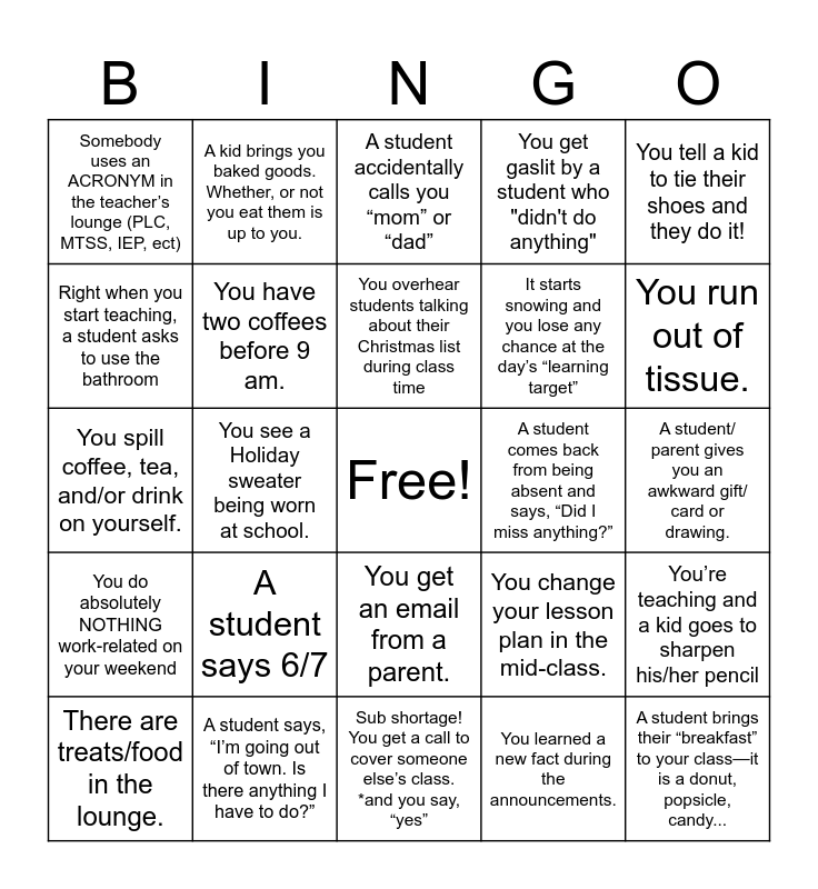 This bingo card has a free space and 24 words: A student says 6/7, A student says, “I’m going out of town. Is there anything I have to do?”, You overhear students talking about their Christmas list during class time, There are treats/food in the lounge., You tell a kid to tie their shoes and they do it!, Somebody uses an ACRONYM in the teacher’s lounge (PLC, MTSS, IEP, ect), Right when you start teaching, a student asks to use the bathroom, A kid brings you baked goods. Whether, or not you eat them is up to you., A student comes back from being absent and says, “Did I miss anything?”, You get an email from a parent., It starts snowing and you lose any chance at the day’s “learning target”, You spill coffee, tea, and/or drink on yourself., You change your lesson plan in the mid-class., You’re teaching and a kid goes to sharpen his/her pencil, You have two coffees before 9 am., You learned a new fact during the announcements., A student/ parent gives you an awkward gift/ card or drawing., A student accidentally calls you “mom” or “dad”, You run out of tissue., You see a Holiday sweater being worn at school., A student brings their “breakfast” to your class—it is a donut, popsicle, candy..., You do absolutely NOTHING work-related on your weekend, You get gaslit by a student who "didn't do anything" and Sub shortage! You get a call to cover someone else’s class. *and you say, “yes”.