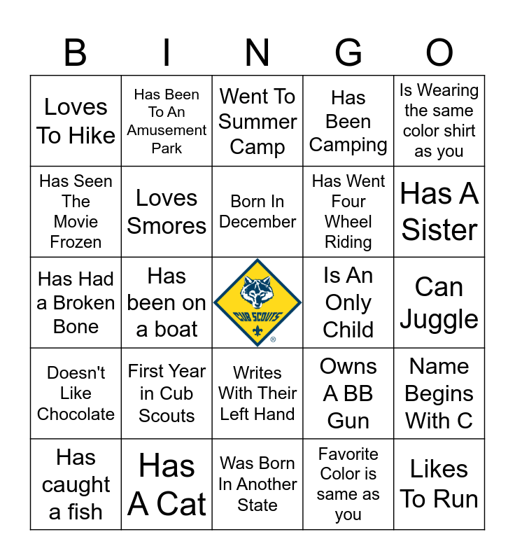 This bingo card has a free space and 24 words: First Year in Cub Scouts, Has A Cat, Born In December, Has caught a fish, Is Wearing the same color shirt as you, Loves To Hike, Has Seen The Movie Frozen, Has Been To An Amusement Park, Is An Only Child, Writes With Their Left Hand, Has Went Four Wheel Riding, Has Had a Broken Bone, Owns A BB Gun, Name Begins With C, Loves Smores, Favorite Color is same as you, Can Juggle, Went To Summer Camp, Has A Sister, Has been on a boat, Likes To Run, Doesn't Like Chocolate, Has Been Camping and Was Born In Another State.
