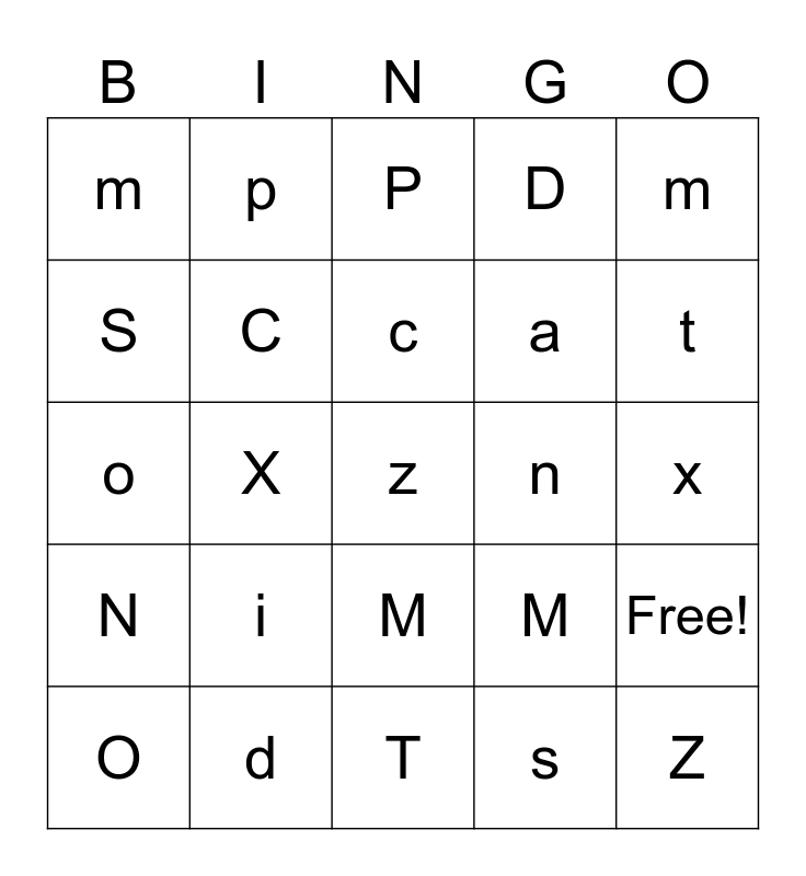 This bingo card has 28 words: Free!, A, a, s, S, P, p, N, n, O, o, D, d, T, t, I, i, C, c, M, m, Z, z, X, x, M, m and d.