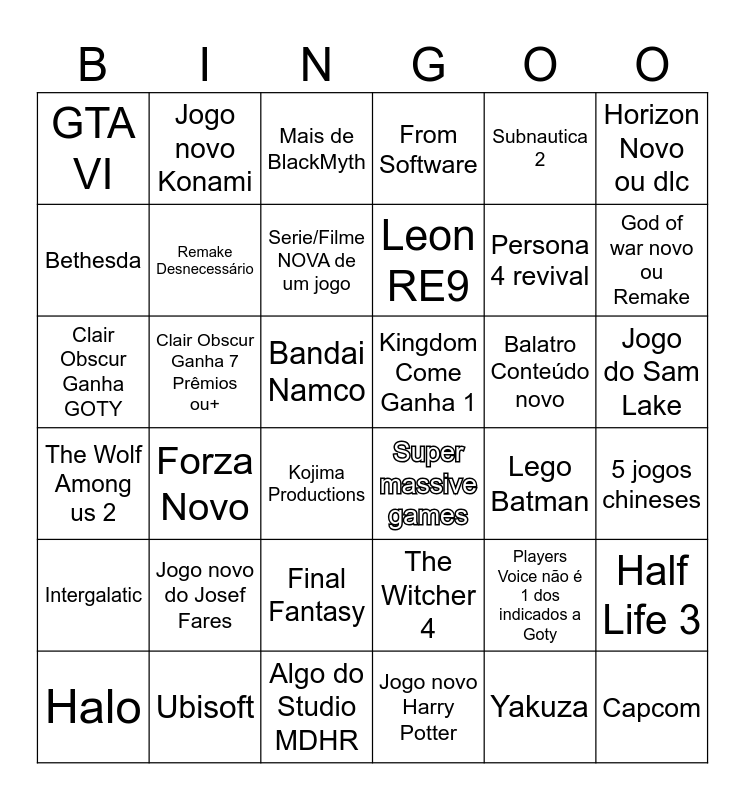 This bingo card has 36 words: The Witcher 4, Final Fantasy, Jogo novo Harry Potter, Bethesda, The Wolf Among us 2, Kingdom Come Ganha 1, Remake Desnecessário, Algo do Studio MDHR, Subnautica 2, Players Voice não é 1 dos indicados a Goty, God of war novo ou Remake, From Software, Half Life 3, Clair Obscur Ganha 7 Prêmios ou+, Leon RE9, GTA VI, Intergalatic, Balatro Conteúdo novo, Clair Obscur Ganha GOTY, Mais de BlackMyth, Bandai Namco, Forza Novo, Super massive games, Kojima Productions, Lego Batman, Jogo novo Konami, Persona 4 revival, Ubisoft, Serie/Filme NOVA de um jogo, Horizon Novo ou dlc, Capcom, Halo, 5 jogos chineses, Jogo do Sam Lake, Jogo novo do Josef Fares and Yakuza.