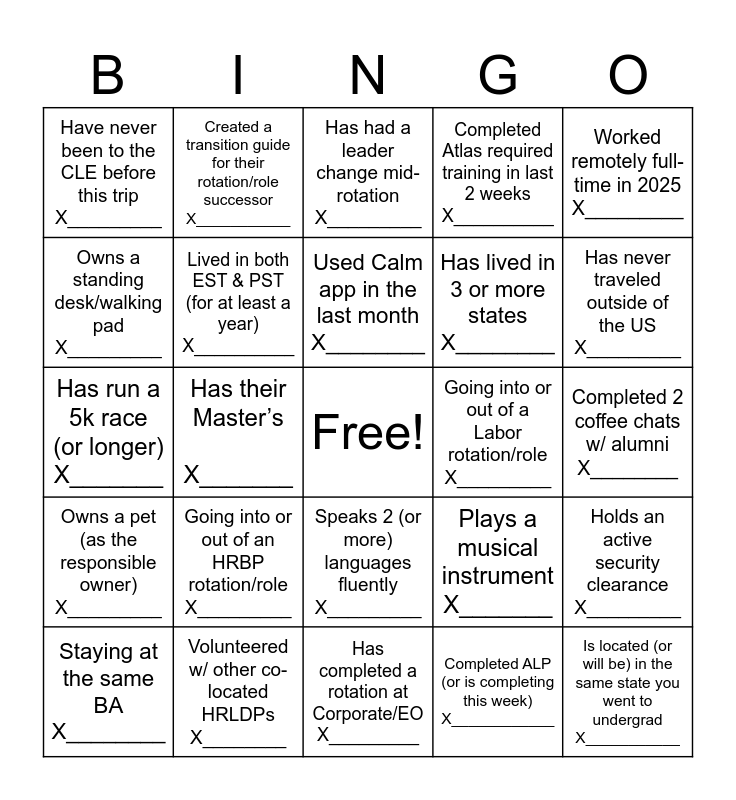 This bingo card has a free space and 29 words: Staying at the same BA X________, Has/is relocating due to a rotation X_________, Has their Master’s X_______, Is enrolled in their Master’s X________, Have never been to the CLE before this trip X_________, Has had a leader change mid-rotation X_________, Lived in both EST & PST (for at least a year) X__________, Going into or out of an HRBP rotation/role X_________, Going into or out of a Labor rotation/role X_________, Volunteered w/ other co-located HRLDPs X________, Completed 2 coffee chats w/ alumni X________, Is located (or will be) in the same state you went to undergrad X___________, Has completed a rotation at Corporate/EO X_________, Completed ALP (or is completing this week) X____________, Has never traveled outside of the US X_________, Attended a live concert in the past year X________, Speaks 2 (or more) languages fluently X_________, Owns a pet (as the responsible owner) X_________, Worked remotely full-time in 2025 X_________, Has run a 5k race (or longer) X_______, Plays a musical instrument X_______, Been to a live sporting event in 2025 X_________, Has lived in 3 or more states X________, Owns a standing desk/walking pad X_________, Completed Atlas required training in last 2 weeks X__________, Created a transition guide for their rotation/role successor X___________, Holds an active security clearance X_________, Used Calm app in the last month X________ and Sent all peer-to-peer LMRecognition awards X__________.