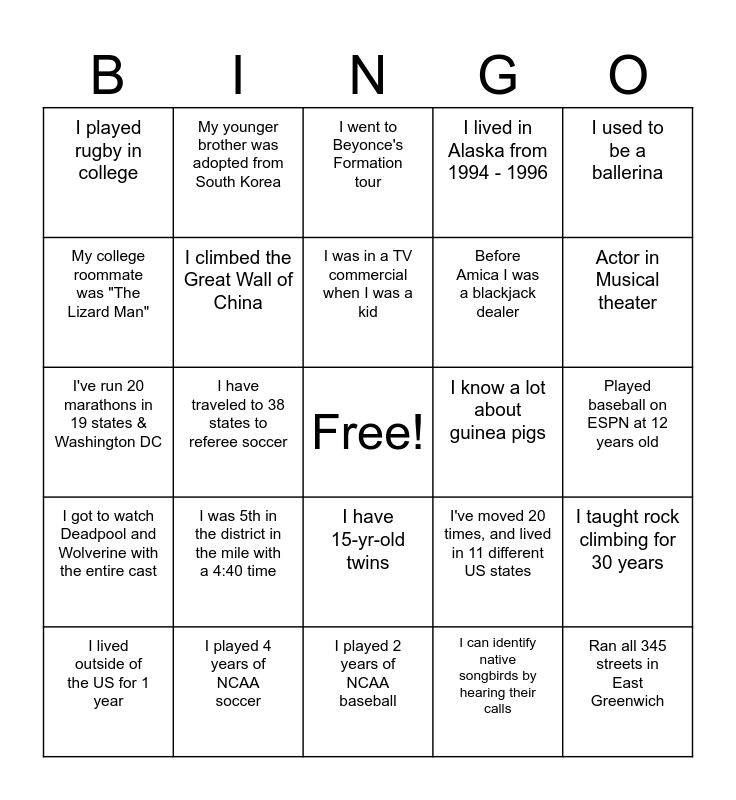 This bingo card has a free space and 41 words: Chemistry was my favorite subject, I've run 20 marathons in 19 states & Washington DC, I have a retired racing greyhound dog, I climbed the Great Wall of China, I played 4 years of NCAA soccer, I have 15-yr-old twins, I was in a TV commercial when I was a kid, In high school I was made the state soccer All Star team, I used to be a ballerina, I got to watch Deadpool and Wolverine with the entire cast, I have traveled to 38 states to referee soccer, I lived in Alaska from 1994 - 1996, Ran all 345 streets in East Greenwich, Played baseball on ESPN at 12 years old, I know a lot about guinea pigs, I was 5th in the district in the mile with a 4:40 time, I have hiked to the bottom of the Grand Canyon and back, I played rugby in college, I enjoy smoking meat as a hobby, I went to Beyonce's Formation tour, I taught rock climbing for 30 years, I accidentally sat on a cactus, I played 2 years of NCAA baseball, Before Amica I was a blackjack dealer, I had a pet alligator named Freddy until we ate him, I harvest my own firewood and heat exclusively with it, I can identify native songbirds by hearing their calls, I am a native New Yorker, Actor in Musical theater, I bruised my funny bone, I have a fraternal twin sister, My younger brother was adopted from South Korea, I lived outside of the US for 1 year, My uncle was the bass guitarist Iron Butterfly., I've moved 20 times, and lived in 11 different US states, My college roommate was "The Lizard Man", I was a DJ at several nightclubs to support myself through college, I love lighthouses so much that I have the Pt Judith Lighthouse tattooed on me, I got engaged at the Nauset Light down the Cape, I can listen to any song and play it back on the piano/keyboard and I got married in Las Vegas.