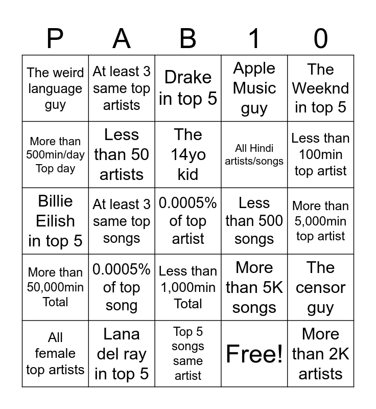 This bingo card has 30 words: Lana del ray in top 5, Top song streamed 500+ times, At least 3 same top songs, Carti/travis in top 5, The weird language guy, Drake in top 5, Less than 50 artists, Less than 1,000min Total, Less than 500 songs, Top 5 songs same artist, More than 5,000min top artist, 0.0005% of top artist, Free!, More than 2K artists, Less than 100min top artist, All native language artists/songs, More than 5K songs, More than 50,000min Total, 0.0005% of top song, The Weeknd in top 5, Billie Eilish in top 5, Kanye in top 5, At least 3 same top artists, All Hindi artists/songs, More than 500min/day Top day, Apple Music guy, The censor guy, All female top artists, The 14yo kid and The NPC.