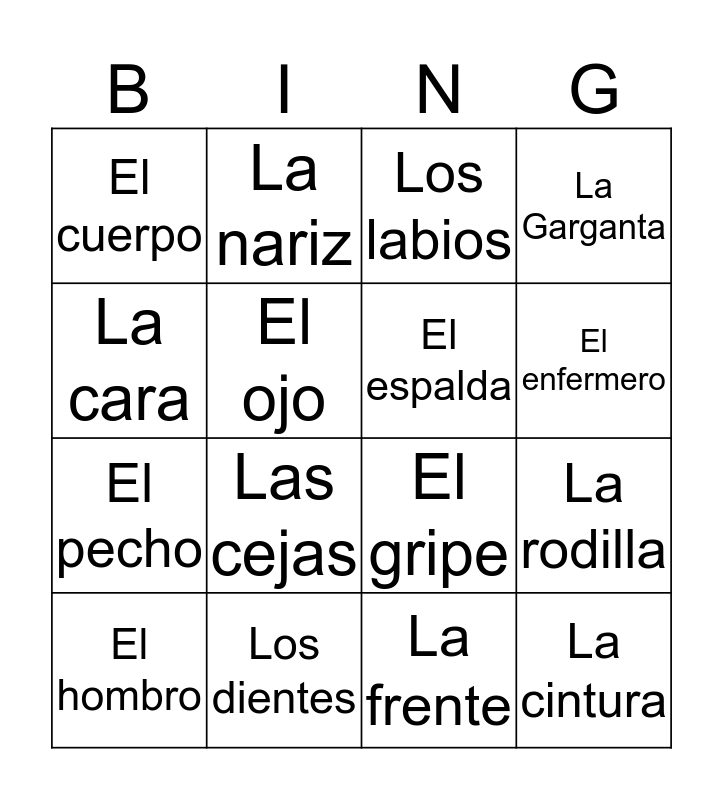 This bingo card has 16 words: Los dientes, La rodilla, Los labios, El cuerpo, El pecho, La nariz, El gripe, La frente, La cara, El ojo, El hombro, La Garganta, Las cejas, El enfermero, El espalda and La cintura.