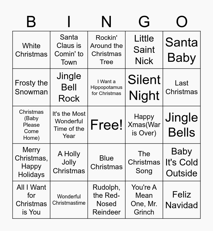 This bingo card has a free space and 29 words: All I Want for Christmas is You, Let It Snow!, It's the Most Wonderful Time of the Year, Santa Tell Me, White Christmas, Rockin' Around the Christmas Tree, Jingle Bell Rock, A Holly Jolly Christmas, Happy Xmas(War is Over), Wonderful Christmastime, Jingle Bells, Feliz Navidad, Rudolph, the Red-Nosed Reindeer, You're A Mean One, Mr. Grinch, Last Christmas, Sleigh Ride, Blue Christmas, Merry Christmas, Happy Holidays, Santa Baby, Christmas (Baby Please Come Home), The Christmas Song, Have Yourself a Merry Little Christmas, Silent Night, Frosty the Snowman, Little Saint Nick, Santa Claus is Comin' to Town, Baby It's Cold Outside, I Want a Hippopotamus for Christmas and Deck the Halls.