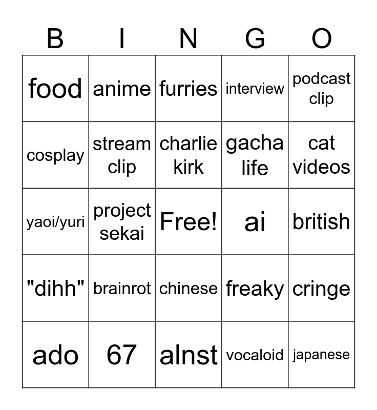 This bingo card has a free space and 24 words: brainrot, 67, charlie kirk, ado, podcast clip, food, cosplay, anime, ai, chinese, gacha life, yaoi/yuri, freaky, cringe, stream clip, vocaloid, british, furries, cat videos, project sekai, japanese, "dihh", interview and alnst.
