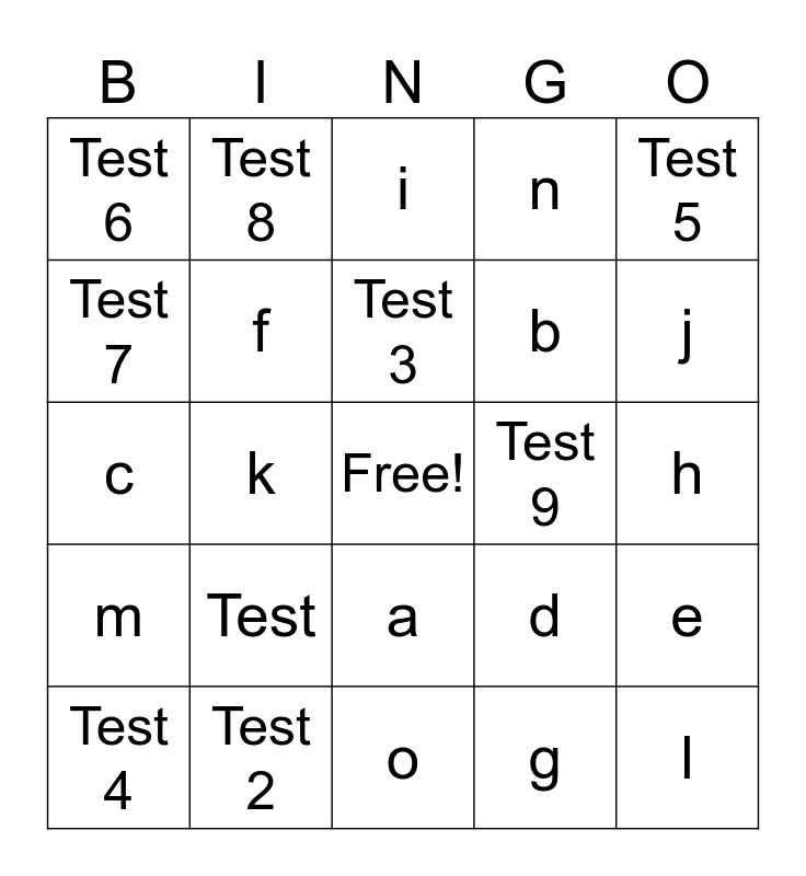 This bingo card has a free space and 24 words: Test, Test 2, Test 3, Test 4, Test 5, Test 6, Test 7, Test 8, Test 9, a, b, c, d, e, f, g, h, i, j, k, l, m, n and o.