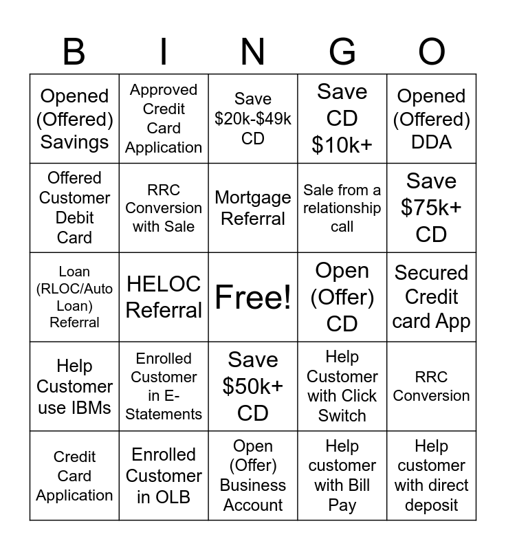 This bingo card has a free space and 24 words: Enrolled Customer in E-Statements, Enrolled Customer in OLB, Mortgage Referral, Credit Card Application, Opened (Offered) DDA, Opened (Offered) Savings, Offered Customer Debit Card, Approved Credit Card Application, Open (Offer) CD, Save $50k+ CD, Sale from a relationship call, Loan (RLOC/Auto Loan) Referral, Help Customer with Click Switch, RRC Conversion, RRC Conversion with Sale, Help customer with Bill Pay, Secured Credit card App, Save $20k-$49k CD, Save $75k+ CD, HELOC Referral, Help customer with direct deposit, Help Customer use IBMs, Save CD $10k+ and Open (Offer) Business Account.