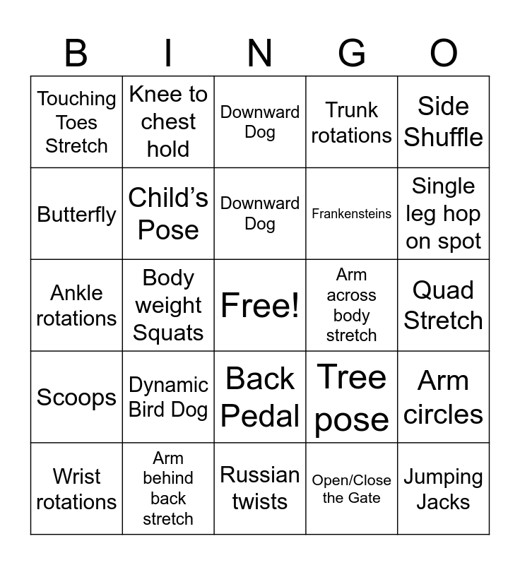 This bingo card has a free space and 27 words: Tree pose, Airplane hold, Frankensteins, Russian twists, Butterfly, Downward Dog, Knee to chest hold, Scoops, Arm across body stretch, Arm circles, Ankle rotations, Trunk rotations, Wrist rotations, Arm behind back stretch, Single leg hop on spot, Basketball Dribbling, Child’s Pose, Downward Dog, Dynamic Bird Dog, Touching Toes Stretch, Quad Stretch, Open/Close the Gate, Body weight Squats, Jumping Jacks, Back Pedal, Side Shuffle and Karaoke.