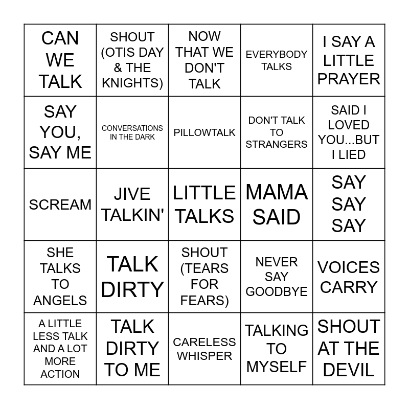 This bingo card has 56 words: A LITTLE LESS CONVERSATION, A LITTLE LESS TALK AND A LOT MORE ACTION, CALL ME, CAN WE TALK, CARELESS WHISPER, COME & TALK TO ME, CONVERSATIONS IN THE DARK, DON'T SPEAK, DON'T TALK TO STRANGERS, EVERYBODY SCREAM, EVERYBODY TALKS, HARD TO SAY I'M SORRY, HOLLABACK GIRL, HOW DO YOU TALK TO AN ANGEL?, I AM..I SAID, I JUST CALLED TO SAY I LOVE YOU, I SAY A LITTLE PRAYER, JIVE TALKIN', LATE NIGHT TALKING, LITTLE TALKS, MAMA SAID, MAMA SAID KNOCK YOU OUT, NEVER SAY GOODBYE, NOW THAT WE DON'T TALK, ONE VOICE, PILLOWTALK, REBEL YELL, ROAR, SAID I LOVED YOU...BUT I LIED, SAY GOODBYE TO HOLLYWOOD, SAY IT AIN'T SO, SAY IT ISN'T SO, SAY IT RIGHT, SAY MY NAME, SAY SAY SAY, SAY YOU, SAY ME, SCREAM, SCREAM & SHOUT, SHE TALKS TO ANGELS, SHOUT (OTIS DAY & THE KNIGHTS), SHOUT (TEARS FOR FEARS), SHOUT AT THE DEVIL, SOMETHING TO TALK ABOUT, SPEAK NOW, STAND UP AND SHOUT, TALK DIRTY, TALK DIRTY TO ME, TALK TO ME, TALKING BODY, TALKING IN YOUR SLEEP, TALKING TO MYSELF, TALKING TO THE MOON, TWIST AND SHOUT, VOICES, VOICES CARRY and WE DON'T TALK ANYMORE.