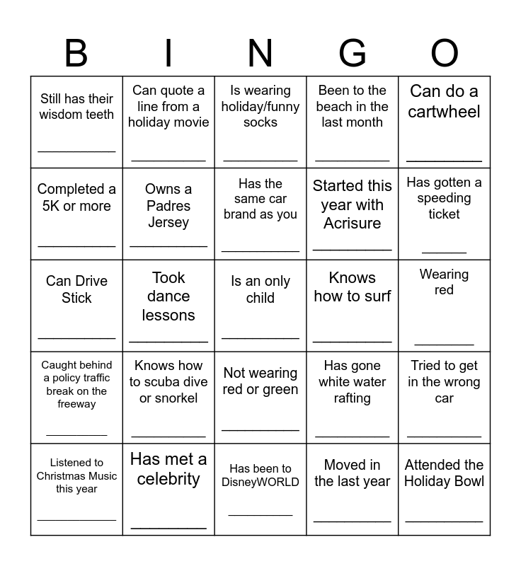 This bingo card has 100 words: Has a Cat ________, Knows how to ski/snowboard ___________, Wearing red ________, Has a Birthday the same month as yours ___________, Has 2 or more children _________, Likes pineapple on pizza ________, Doesn't drink coffee _________, Has ridden a horse _______, Can hula hoop more than 2 minutes ___________, Travelled to more than 4 countries ____________, Has been on TV ________, Someone who loves eggnog _________, Have used a Typewriter __________, Has met a celebrity ________, Has 3 or more siblings ________, Played a sport in school _________, Started this year with Acrisure _________, Thinks Die Hard is a Christmas movie ___________, Knows how to surf _________, Wearing green ______, Can speak 2 languages _________, Has not called IT this month _________, Does not have a pet ________, Has lived outside of California ________, Has a dog _________, Knows how to surf _________, Can do a cartwheel ________, Has gone white water rafting __________, Has been to more than 3 National Parks ___________, Has a nickname __________, Took dance lessons _________, Still has their wisdom teeth ___________, Has taken a cruise __________, Won a contest _________, Moved in the last year __________, Has the same car brand as you ___________, Tried to get in the wrong car __________, Has a snack stash in their desk ___________, Can drive stick __________, Attended the Holiday Bowl __________, Attended the Rose Bowl parade ___________, Has been at Acrisure longer than you ___________, Can Drive Stick __________, Attended a concert at Humphreys or the Shell __________, Has gotten a speeding ticket ______, Is wearing holiday/funny socks __________, Worn an old school wrist watch in the last year __________, Had braces __________, Watches reality TV __________, Has been to DisneyWORLD __________, Watched a movie in a theater this year ____________, Has seen live the Nutcracker or How the Grinch Stole Christmas _____________, Does knits, crochets or crafts __________, Has an insurance designation __________, Used a fake name/phone number __________, Maintained a friendship since elementary school __________, Been to the San Diego Zoo/Safari Park in the last year __________, Ice skated at the Del or Viejas __________, Attended an event at Snapdragon stadium __________, Been to the beach in the last month __________, Drank tea in the last week __________, Not received a jury duty notice in the last year __________, Is a middle child __________, Born in California __________, Born outside of California __________, Is left-handed __________, Has workout equipment at home __________, Works in the office 3+ days per week __________, Is an only child __________, Is a grandparent __________, Plays an instrument __________, Knows how to scuba dive or snorkel __________, House is decorated for the holidays __________, Who has a food allergy __________, Who is vegetarian or vegan __________, Wears glasses __________, Has 2 different types of pets __________, Completed a 5K or more __________, Attended an event at Snapdragon stadium ____________, Plays an instrument __________, Is a grandparent __________, Is an only child __________, Wearing holiday hat, headband, or jewelry ____________, Not wearing red or green __________, Owns a Jack in the Box antenna ball __________, Can quote a line from a holiday movie __________, Put holiday decor up before Thanksgiving __________, Visited 10 states or more __________, Been to Washington D.C. __________, Caught behind a policy traffic break on the freeway __________, Been to Miramar Air Show __________, Been to Balboa Park Botanical Garden or a Museum ____________, Watched 3 holiday movies this season ____________, Listened to Christmas Music this year _____________, Owns a Padres Jersey __________, Had a Blockbuster or Hollywood Video Membership ____________, Had a AOL or MySpace Account ____________, First Responder family member __________, Climbed a tree __________ and Attended event at San Diego Convention Center ____________.