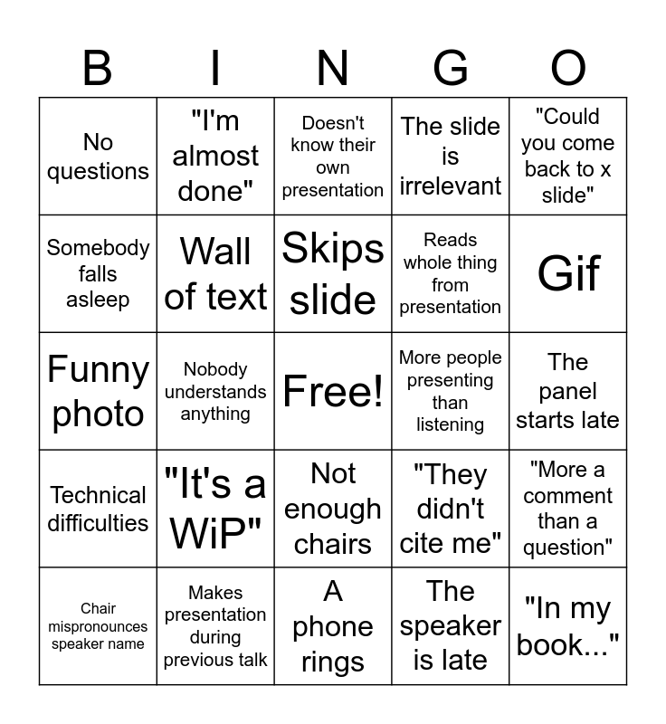 This bingo card has a free space and 24 words: "It's a WiP", Makes presentation during previous talk, Skips slide, Chair mispronounces speaker name, "Could you come back to x slide", No questions, Somebody falls asleep, "I'm almost done", More people presenting than listening, Not enough chairs, Reads whole thing from presentation, Funny photo, "They didn't cite me", "More a comment than a question", Wall of text, The speaker is late, The panel starts late, Doesn't know their own presentation, Gif, Nobody understands anything, "In my book...", Technical difficulties, The slide is irrelevant and A phone rings.