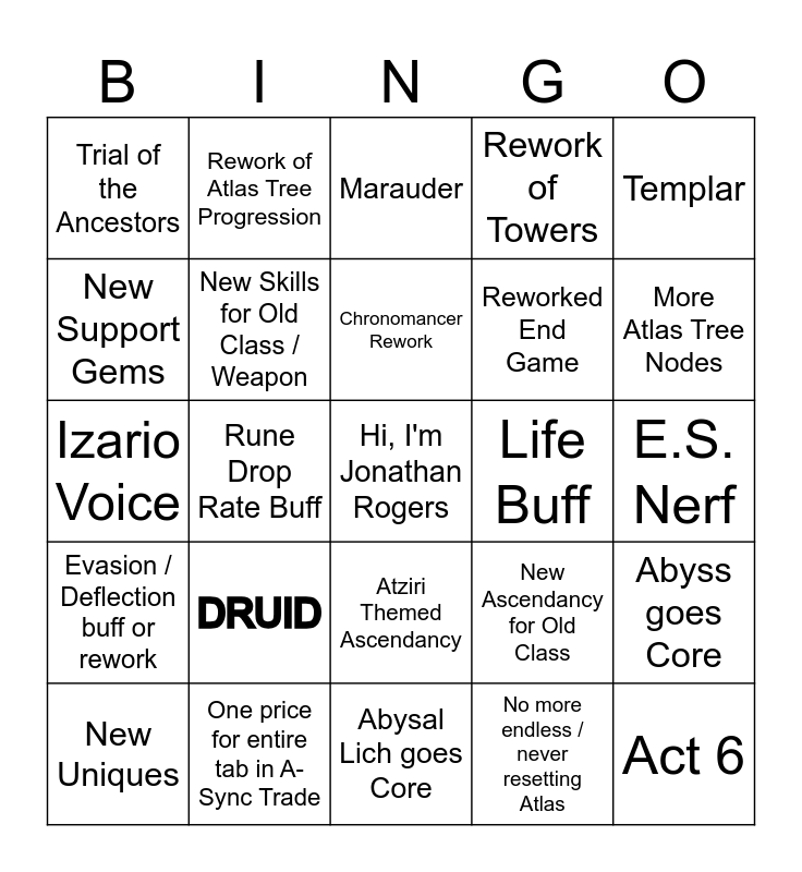 This bingo card has a free space and 24 words: DRUID, One price for entire tab in A-Sync Trade, Chronomancer Rework, New Uniques, Templar, Trial of the Ancestors, New Support Gems, Rework of Atlas Tree Progression, Life Buff, Atziri Themed Ascendancy, Reworked End Game, Izario Voice, New Ascendancy for Old Class, Abyss goes Core, New Skills for Old Class / Weapon, No more endless / never resetting Atlas, E.S. Nerf, Marauder, More Atlas Tree Nodes, Rune Drop Rate Buff, Act 6, Evasion / Deflection buff or rework, Rework of Towers and Abysal Lich goes Core.