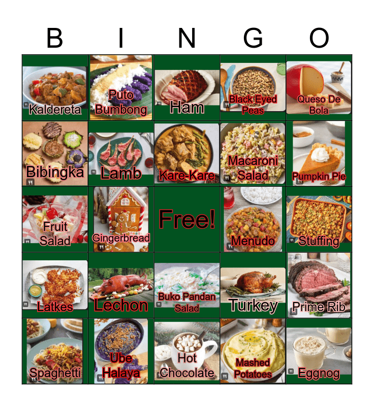 This bingo card has 24 images, a free space and 24 words: Lechon, Ube Halaya, Kare-Kare, Spaghetti, Queso De Bola, Kaldereta, Bibingka, Puto Bumbong, Menudo, Buko Pandan Salad, Macaroni Salad, Fruit Salad, Turkey, Prime Rib, Lamb, Mashed Potatoes, Stuffing, Ham, Pumpkin Pie, Gingerbread, Eggnog, Latkes, Black Eyed Peas and Hot Chocolate.