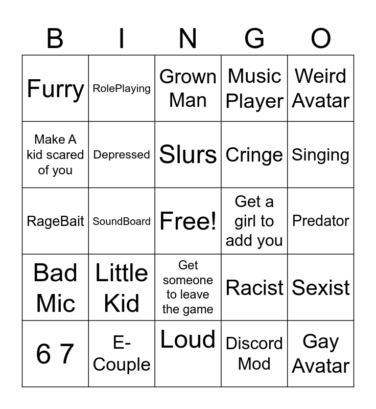 This bingo card has a free space and 24 words: Little Kid, E-Couple, Slurs, 6 7, Weird Avatar, Furry, Make A kid scared of you, RolePlaying, Get a girl to add you, Get someone to leave the game, Cringe, RageBait, Racist, Sexist, Depressed, Discord Mod, Predator, Grown Man, Singing, SoundBoard, Gay Avatar, Bad Mic, Music Player and Loud.