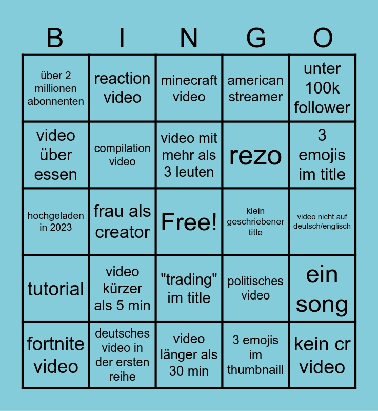 This bingo card has a free space and 24 words: video kürzer als 5 min, deutsches video in der ersten reihe, video mit mehr als 3 leuten, fortnite video, unter 100k follower, über 2 millionen abonnenten, video über essen, reaction video, klein geschriebener title, "trading" im title, rezo, hochgeladen in 2023, politisches video, ein song, compilation video, 3 emojis im thumbnaill, video nicht auf deutsch/englisch, minecraft video, 3 emojis im title, frau als creator, kein cr video, tutorial, american streamer and video länger als 30 min.