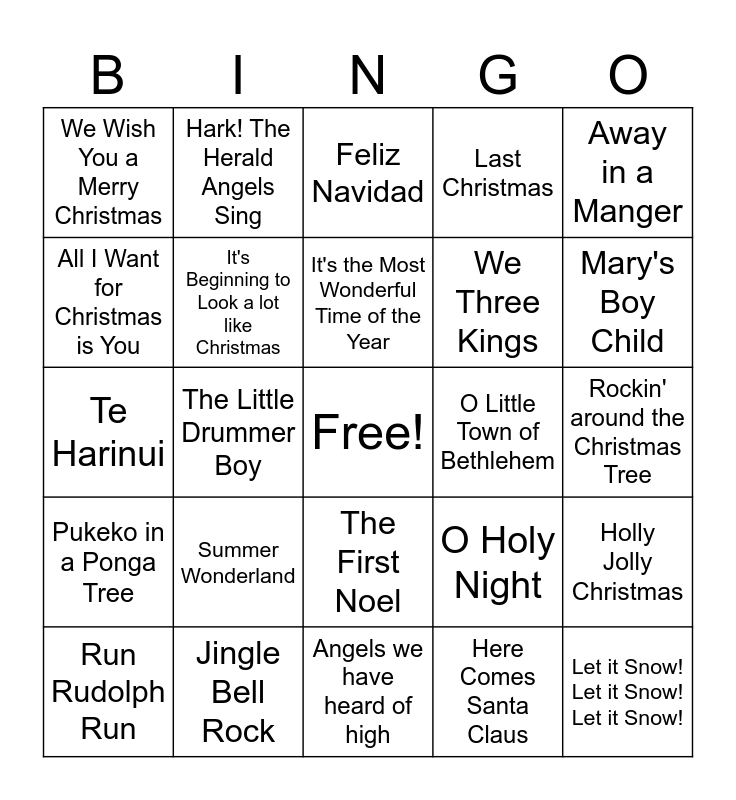 This bingo card has a free space and 30 words: Jingle Bell Rock, Silent Night, The Little Drummer Boy, Deck the Halls, We Wish You a Merry Christmas, Feliz Navidad, It's Beginning to Look a lot like Christmas, The First Noel, O Little Town of Bethlehem, Angels we have heard of high, Rockin' around the Christmas Tree, Let it Snow! Let it Snow! Let it Snow!, Here Comes Santa Claus, Santa Clause is Coming to Town, Mary's Boy Child, Joy to the World, O Holy Night, Pukeko in a Ponga Tree, Summer Wonderland, Away in a Manger, Te Harinui, O Come all Ye Faithful, Hark! The Herald Angels Sing, We Three Kings, All I Want for Christmas is You, Last Christmas, Holly Jolly Christmas, Run Rudolph Run, It's the Most Wonderful Time of the Year and Joyful, Joyful.
