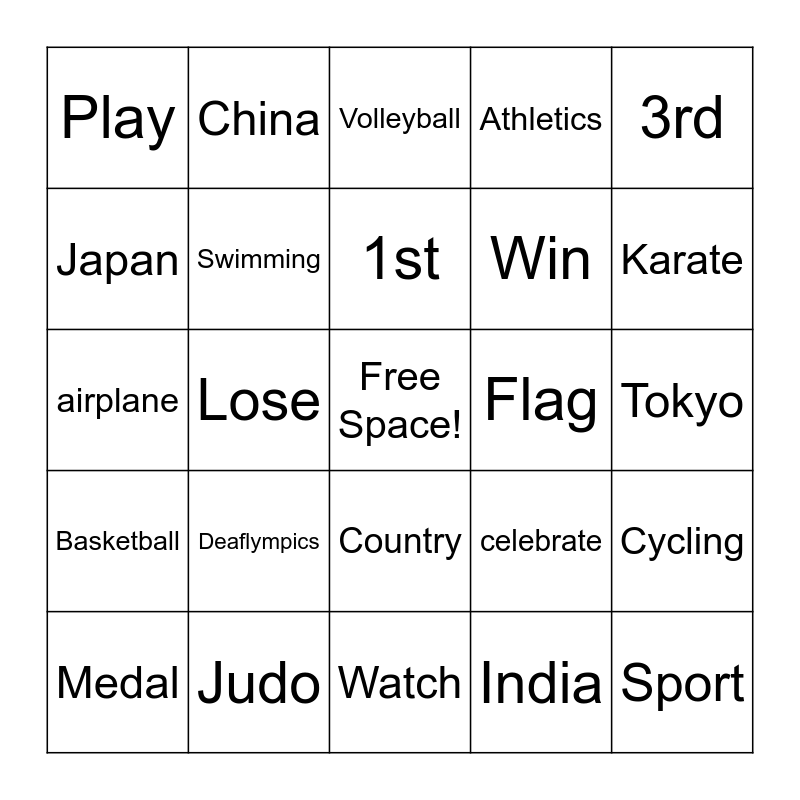 This bingo card has a free space and 38 words: Gold, Silver, Bronze, Swimming, Cycling, Deaflympics, 1st, 2nd, 3rd, Win, Lose, Athletics, Sport, Tokyo, Japan, Basketball, Australia, Volleyball, Tennis, Flag, Play, Judo, Karate, Medal, Soccer, Watch, Red, Yellow, Blue, Green, USA, Country, India, China, Ukraine, celebrate, airplane and France.