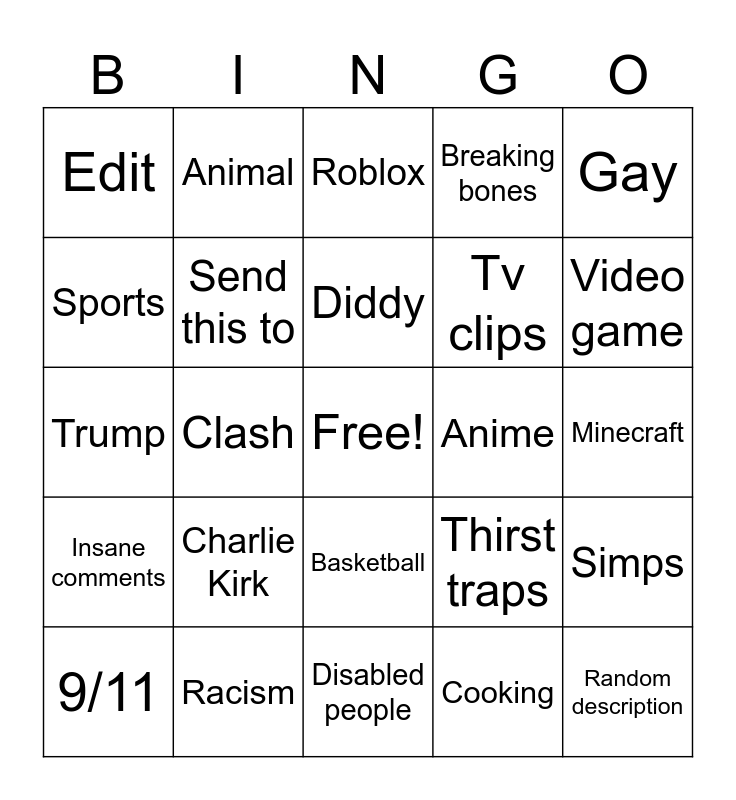 This bingo card has a free space and 24 words: Charlie Kirk, Racism, Diddy, 9/11, Gay, Edit, Sports, Animal, Anime, Basketball, Tv clips, Trump, Thirst traps, Simps, Send this to, Cooking, Minecraft, Roblox, Video game, Clash, Random description, Insane comments, Breaking bones and Disabled people.