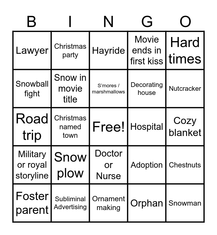 This bingo card has a free space and 149 words: A break up, A deadline, A secret, A surprise, Accident, Adoption, Advertising, Airport or airplane, Antique store, Artist, Author, Bad weather, Baker, Bakery or Candy Store, Balsam Hill reference, Bell ringer, Bookstore, Candy cane, Car trouble, Carols / singing, Ceramic Village, Chestnuts, Christmas apron, "Christmas" in movie title, Christmas market, Christmas named town, Christmas party, Christmas sweater, Cider, Coffee, Coffee shop, Contest, Cookie baking, Cozy blanket, Cozy inn or cabin, Cut down tree, Dance, Dead parent, Decorating house, Delay or detour, Discovered connections, Divorced, Doctor or Nurse, Eating cookies, Eggnog, Engagement, Estranged, Family business, Family tradition, Family or holiday meal, Fire or fireplace, Foreign country, Foster parent, Fruitcake, Gift exchange, Gift opening, Gift wrapping, Gingerbread house, Going home for the holidays, Handmade gift, Hard times, Hayride, Heartbreak, Holiday trip, Holiday in movie title, Homeless person / family, Hospital, Hot chocolate, Illness, Injury, Interrupted kiss, Kettle corn, Kiss in snow, Lawyer, Letter, Matching PJs, Mention of “Christmas magic“, Mention of “Christmas spirit“, Military or royal storyline, Missed flight, Mistletoe, Misunderstanding, Movie ends in first kiss, Musician, New job, No family to spend holidays with, Nutcracker, Office with decorations, Old flame, Old school mate, Ornament making, Orphan, Popcorn, Prayer, Pregnancy or new baby, Reading a story, Red dress, Red jacket, Red truck, Reindeer, Road trip, Santa, Secret admirer, Sentimental ornament, Shooting star, Shopping, Shoveling snow, Single parent, Skating, Skiing, Sledding, Sleigh / carriage ride, S’mores / marshmallows, Snow angel, Snow globe, Snow in movie title, Snow plow, Snowball fight, Snowed in, Snowfall kiss, Snowman, Special recipe, Squeaky brakes, Stockings, Teacher, Time travel, Tow truck, Town tree lighting, Town handyman, Town traditions, Toy store, Tree decorating, Tree lot, Tucking kid in bed, Unprepared for the weather, Untangle lights, Volunteering, Wedding, Widow, Wine, Wish, Workaholic, Wreath making, Subliminal Advertising, Mountains, A hard decision, Dead grandparent, Mistletoe and Niece/Nephew Aunt/Uncle.