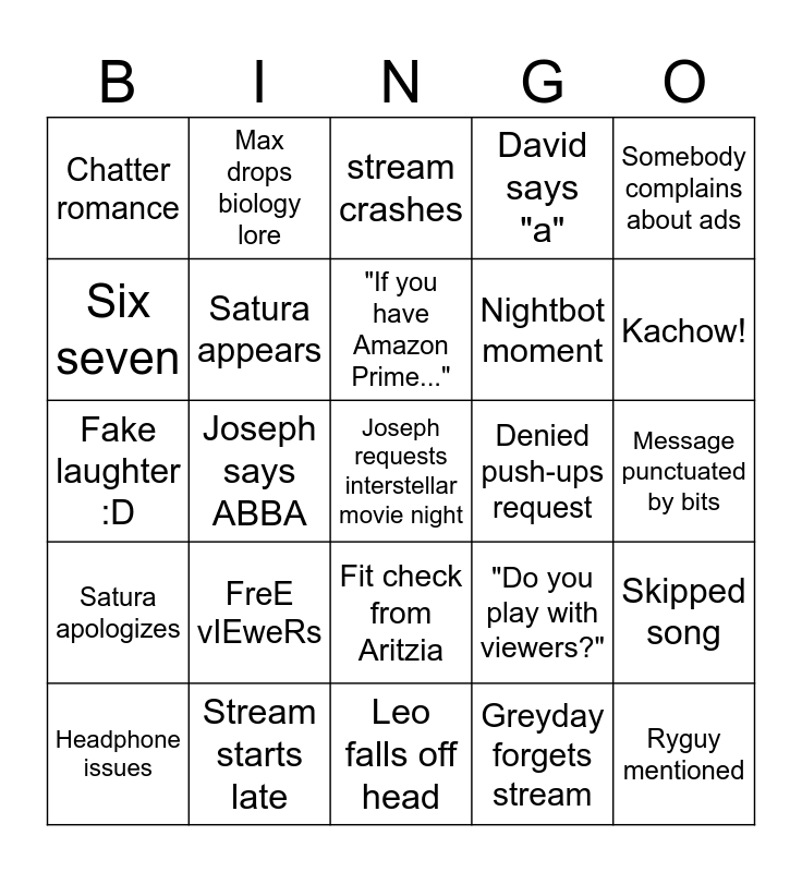 This bingo card has a free space and 50 words: truthbetold..., Ryguy mentioned, Martin gigantify's sloth, Leo falls off head, FreE vIEweRs, Emma has to go to bed, Max drops biology lore, Hamsteak brings up politics, Six seven, Goob mentioned, Satura appears, David says "a", Skipped song, "Do you play with viewers?", Truth says "wait hold on" scrolling chat, Gifted subs, "If you have Amazon Prime...", Denied push-ups request, Truth says no-no word, Somebody complains about ads, Joseph says ABBA, Greyday forgets stream, Chatter romance, Nightbot moment, Truth is mercilessly bullied, Fruity moments, Kachow!, FNAF song, stream crashes, Fit check from Aritzia, "Me when I...", Chat goes to jail, "Where is game code", *Hilarious* spam, Stream starts late, "Clip that", Victim of the raid, "Wait are you Canadian?", Jumby, Message punctuated by bits, Random discussion about everyone's age, SCOTLAND FOREVER, Truth only speaks English moment, Three song requests within 5 minutes, Headphone issues, Fake laughter :D, Truth avoids reading something, Moment moment, Satura apologizes and "Why aren't you family friendly?".