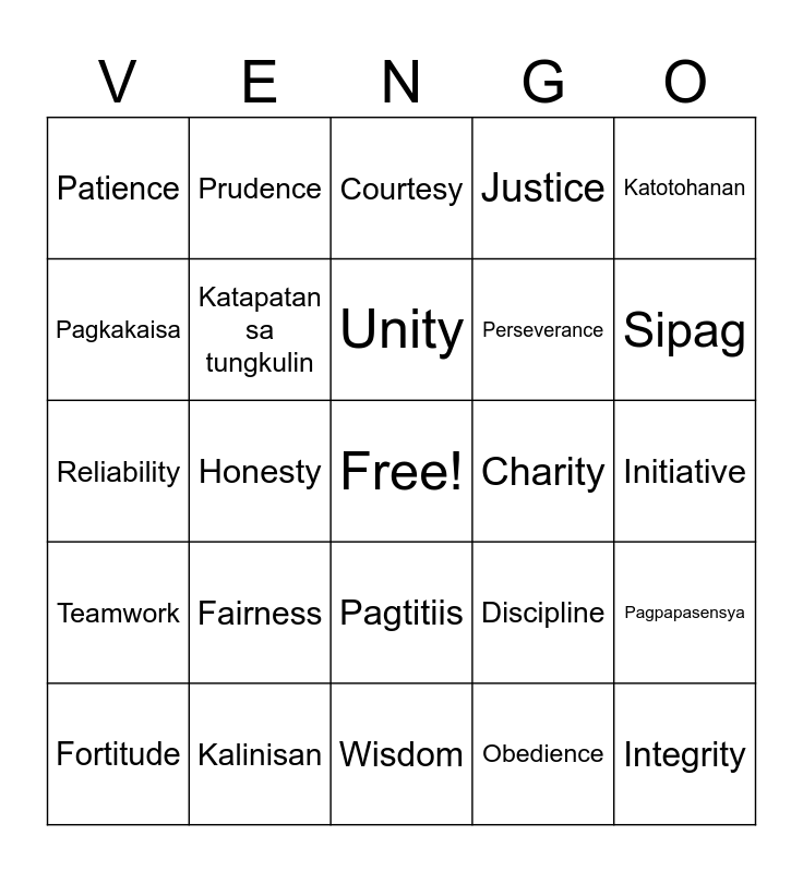 This bingo card has a free space and 75 words: Respect, Respeto, Courtesy, Paggalang, Kindness, Kabutihan, Compassion, Pagmamalasakit, Gentleness, Pagdadamayan, Love, Pagmamahal, Unity, Pagkakaisa, Pananagutan, Honesty, Katapatan, Integrity, Truthfulness, Katotohanan, Sincerity, Reliability, Katapatan sa tungkulin, Prudence, Justice, Katarungan, Pagpapakatao, Tiwala, Modesty, Pagpapahalaga, Responsibility, Self-Control, Pagtitimpi, Discipline, Sipag, Perseverance, Diligence, Determination, Initiative, Obedience, Kaayusan, Pag-iingat, Creativity, Service, Paglilingkod, Courage, Fortitude, Patience, Tolerance, Forgiveness, Pagpapatawad, Pagtitiis, Humility, Peace, Kapayapaan, Open-mindedness, Pag-asa, Pagkamahinahon, Loyalty, Kabanalan, Fairness, Cooperation, Pakikipagtulungan, Generosity, Pagkamapagbigay, Charity, Pagpapasalamat, Gratitude, Empathy, Pagpapasensya, Teamwork, Kalinisan, Karunungan, Wisdom and Good judgment.