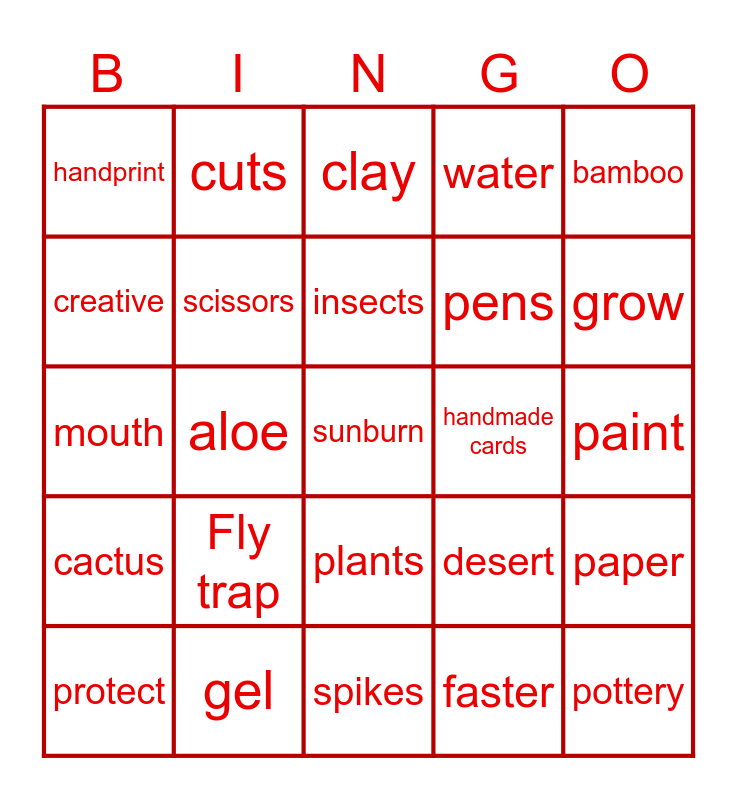 This bingo card has a free space and 24 words: Fly trap, gel, insects, protect, bamboo, handprint, creative, cuts, handmade cards, plants, pens, mouth, desert, paper, scissors, faster, paint, clay, grow, aloe, pottery, cactus, water and spikes.