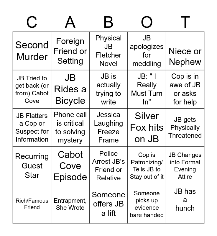 This bingo card has a free space and 24 words: Cabot Cove Episode, Entrapment, She Wrote, JB is actually trying to write, Rich/Famous Friend, Niece or Nephew, Second Murder, JB Tried to get back (or from) Cabot Cove, Foreign Friend or Setting, Silver Fox hits on JB, Police Arrest JB's Friend or Relative, JB: " I Really Must Turn In", JB Flatters a Cop or Suspect for Information, Cop is Patronizing/ Tells JB to Stay out of it, JB Changes into Formal Evening Attire, JB Rides a Bicycle, Someone picks up evidence bare handed, JB gets Physically Threatened, Physical JB Fletcher Novel, Cop is in awe of JB or asks for help, Phone call is critical to solving mystery, JB has a hunch, Recurring Guest Star, JB apologizes for meddling and Someone offers JB a lift.