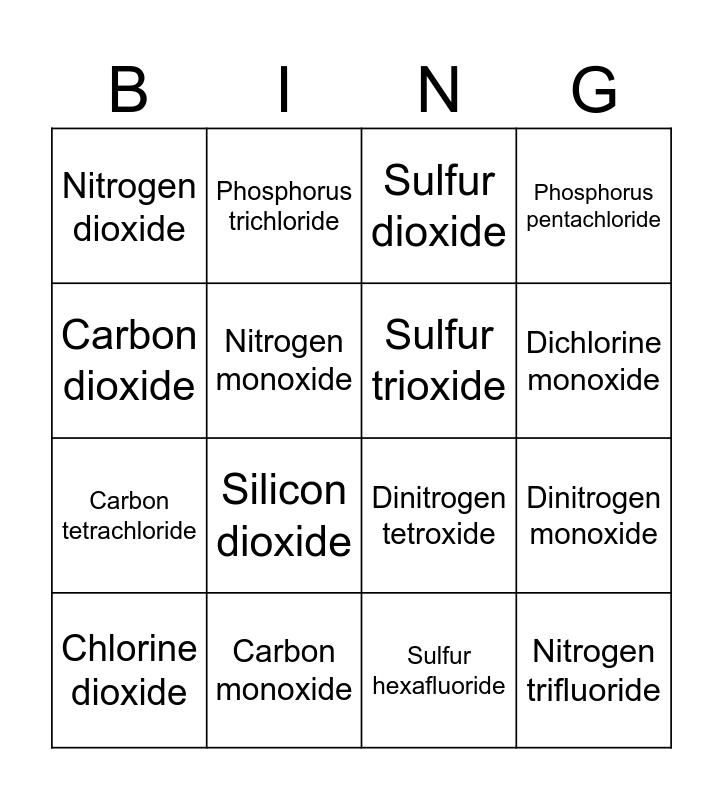This bingo card has 16 words: Carbon monoxide, Dinitrogen monoxide, Sulfur dioxide, Nitrogen dioxide, Carbon tetrachloride, Phosphorus trichloride, Dinitrogen tetroxide, Sulfur hexafluoride, Carbon dioxide, Nitrogen monoxide, Chlorine dioxide, Phosphorus pentachloride, Silicon dioxide, Dichlorine monoxide, Sulfur trioxide and Nitrogen trifluoride.