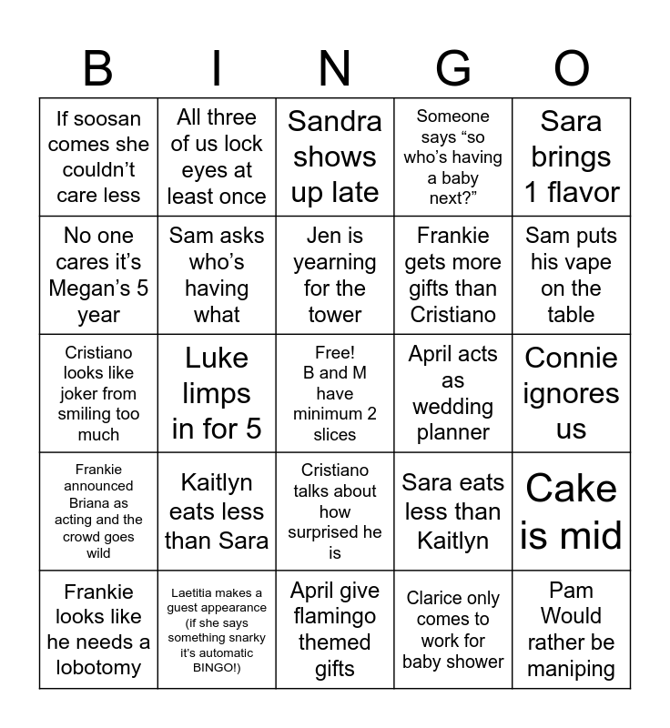 This bingo card has a free space and 24 words: Kaitlyn eats less than Sara, Laetitia makes a guest appearance (if she says something snarky it’s automatic BINGO!), Jen is yearning for the tower, Frankie looks like he needs a lobotomy, Sara brings 1 flavor, If soosan comes she couldn’t care less, No one cares it’s Megan’s 5 year, All three of us lock eyes at least once, April acts as wedding planner, Cristiano talks about how surprised he is, Frankie gets more gifts than Cristiano, Cristiano looks like joker from smiling too much, Sara eats less than Kaitlyn, Cake is mid, Sam asks who’s having what, Clarice only comes to work for baby shower, Connie ignores us, Sandra shows up late, Sam puts his vape on the table, Luke limps in for 5, Pam Would rather be maniping, Frankie announced Briana as acting and the crowd goes wild, Someone says “so who’s having a baby next?” and April give flamingo themed gifts.