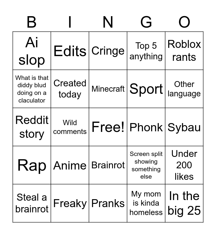 This bingo card has a free space and 24 words: Anime, Freaky, Minecraft, Steal a brainrot, Roblox rants, Ai slop, What is that diddy blud doing on a claculator, Edits, Phonk, Brainrot, Sport, Reddit story, Screen split showing something else, Under 200 likes, Created today, My mom is kinda homeless, Sybau, Cringe, Other language, Wild comments, In the big 25, Rap, Top 5 anything and Pranks.