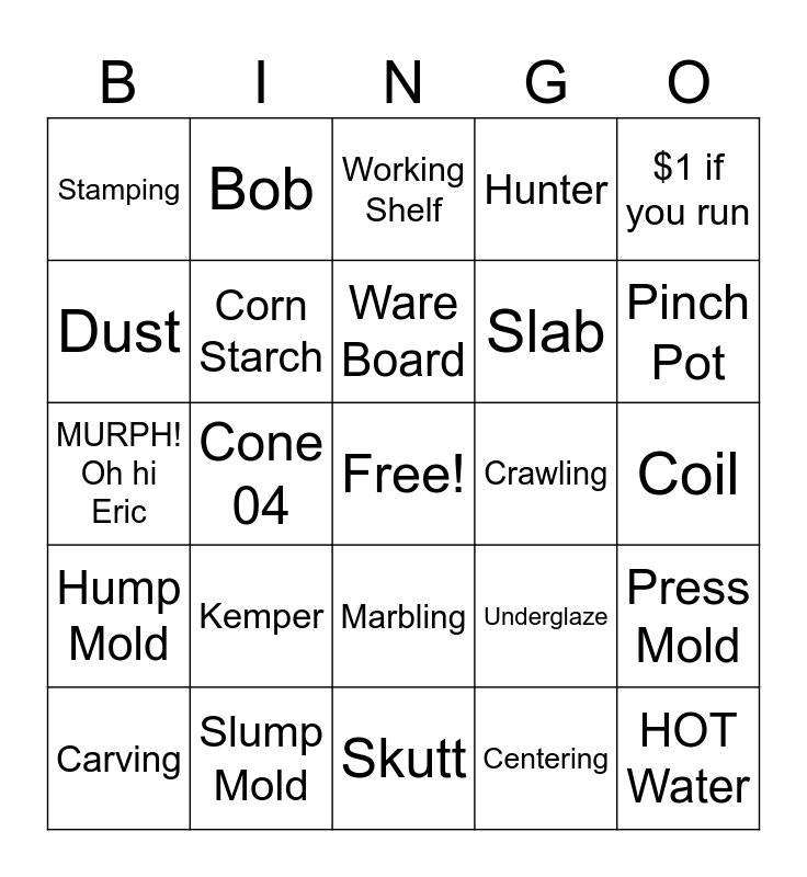 This bingo card has a free space and 75 words: Kiln Gods, Is that what you want it to look like?, Working Shelf, Rib, 553, 112, 551, 214, 266, 182, Needle Tool, Sponge, Ware Board, Dust, Cone 5, Cone 04, Cone 6, HOT Water, Magic Water, $1 if you run, Shrinkage, MURPH! Oh hi Eric, Corn Starch, Bob, Hunter, Instructors, Students, Odin!, U.P.O., Slip and Score, Pug Clay, Bisque, Glaze, Underglaze, Pinch Pot, Slab, Pin Holes, Over Fire, Coil, Centering, Opening, Pulling, Shaping, Sgraffito, Slab Roller, Texture, Carving, Stamping, Spray Booth, Slip Trailing, Test Tile, Marbling, Raku, Wood Fire, Dipping, Pouring, Brushing, Stroke & Coat, Amaco, Mayco, Kemper, Diamond Sponge, Spraying, Is your name on the bottom?, Wax Resist, Crawling, Kiln, Cones, Plaster Mold, Press Mold, Hump Mold, Slump Mold, Pugmill, Skutt and Standard.