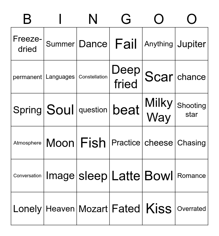 This bingo card has 36 words: Atmosphere, Moon, Mozart, Deep fried, Milky Way, Shooting star, Freeze-dried, Heaven, Dance, Latte, Scar, Jupiter, Conversation, Soul, Constellation, Fail, Bowl, Chasing, permanent, Languages, Fish, Practice, cheese, Romance, Spring, Summer, question, Fated, Anything, chance, Lonely, Image, sleep, beat, Kiss and Overrated.