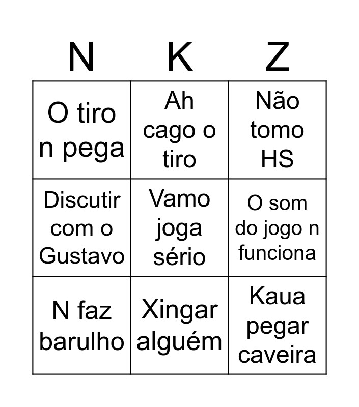 This bingo card has a free space and 8 words: O som do jogo n funciona, Não tomo HS, Ah cago o tiro, N faz barulho, O tiro n pega, Kaua pegar caveira, Discutir com o Gustavo and Xingar alguém.