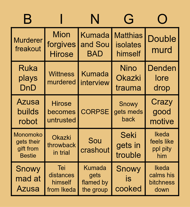 This bingo card has a free space and 24 words: Okazki throwback in trial, Tei distances himself from Ikeda, Kumada interview, Snowy mad at Azusa, Double murd, Murderer freakout, Ruka plays DnD, Mion forgives Hirose, Snowy gets meds back, Sou crashout, Nino Okazki trauma, Azusa builds robot, Seki gets in trouble, Ikeda feels like ppl pity him, Wittness murdered, Snowy is cooked, Crazy good motive, Kumada and Sou BAD, Denden lore drop, Hirose becomes untrusted, Ikeda calms his bitchness down, Monomoko gets their gift from Bestie, Matthias isolates himself and Kumada gets flamed by the group.