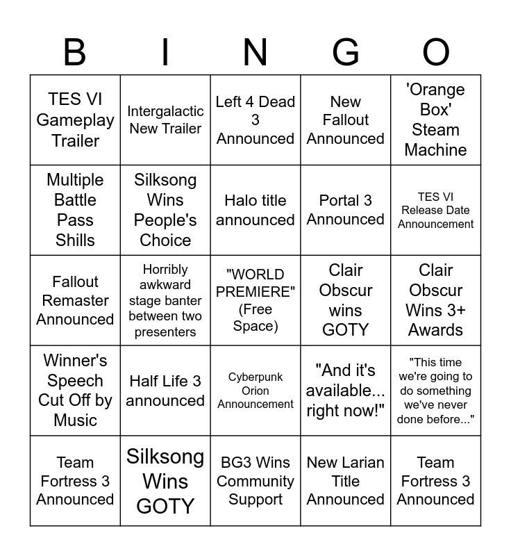 This bingo card has a free space and 24 words: Half Life 3 announced, Silksong Wins GOTY, Halo title announced, Team Fortress 3 Announced, 'Orange Box' Steam Machine, TES VI Gameplay Trailer, Multiple Battle Pass Shills, Intergalactic New Trailer, Clair Obscur wins GOTY, Cyberpunk Orion Announcement, Portal 3 Announced, Fallout Remaster Announced, "And it's available... right now!", "This time we're going to do something we've never done before...", Silksong Wins People's Choice, New Larian Title Announced, Clair Obscur Wins 3+ Awards, Left 4 Dead 3 Announced, TES VI Release Date Announcement, Horribly awkward stage banter between two presenters, Team Fortress 3 Announced, Winner's Speech Cut Off by Music, New Fallout Announced and BG3 Wins Community Support.