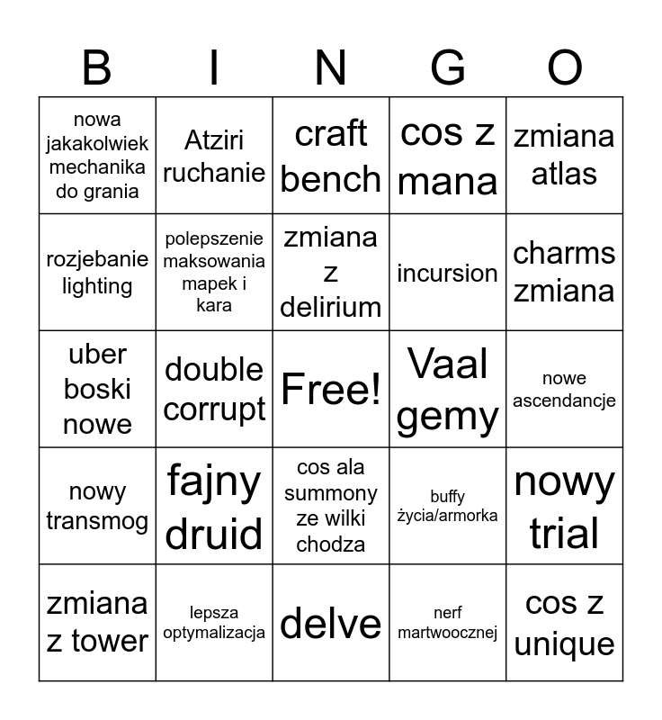 This bingo card has a free space and 24 words: fajny druid, lepsza optymalizacja, zmiana z delirium, zmiana z tower, zmiana atlas, nowa jakakolwiek mechanika do grania, rozjebanie lighting, Atziri ruchanie, Vaal gemy, cos ala summony ze wilki chodza, incursion, uber boski nowe, buffy życia/armorka, nowy trial, polepszenie maksowania mapek i kara, nerf martwoocznej, nowe ascendancje, craft bench, charms zmiana, double corrupt, cos z unique, nowy transmog, cos z mana and delve.