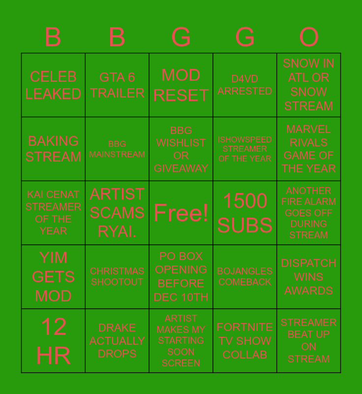 This bingo card has a free space and 24 words: CHRISTMAS SHOOTOUT, DRAKE ACTUALLY DROPS, BBG WISHLIST OR GIVEAWAY, 12 HR, SNOW IN ATL OR SNOW STREAM, CELEB LEAKED, BAKING STREAM, GTA 6 TRAILER, 1500 SUBS, PO BOX OPENING BEFORE DEC 10TH, ISHOWSPEED STREAMER OF THE YEAR, KAI CENAT STREAMER OF THE YEAR, BOJANGLES COMEBACK, DISPATCH WINS AWARDS, BBG MAINSTREAM, FORTNITE TV SHOW COLLAB, ANOTHER FIRE ALARM GOES OFF DURING STREAM, MOD RESET, MARVEL RIVALS GAME OF THE YEAR, ARTIST SCAMS RYAI., STREAMER BEAT UP ON STREAM, YIM GETS MOD, D4VD ARRESTED and ARTIST MAKES MY STARTING SOON SCREEN.