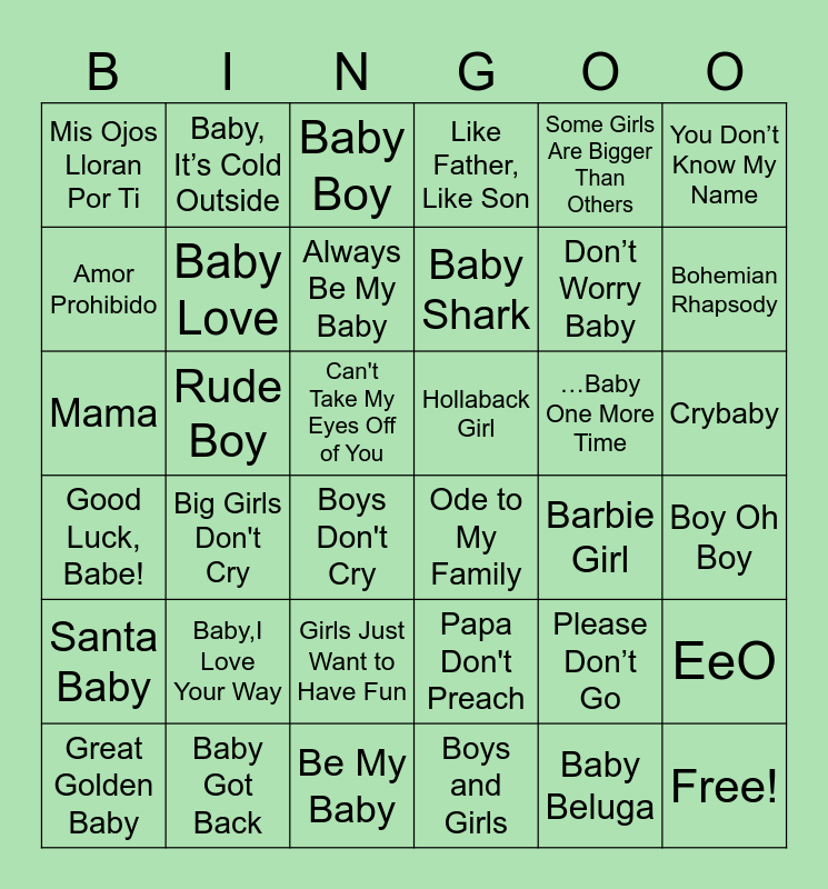 This bingo card has 42 words: Baby Beluga, Baby Love, I Got You Babe, …Baby One More Time, Boy Oh Boy, Big Girls Don't Cry, Mama, Baby, I’m Yours, Baby Boy, Crybaby, Can't Take My Eyes Off of You, Baby Shark, Bohemian Rhapsody, Some Girls Are Bigger Than Others, Baby Got Back, Good Luck, Babe!, EeO, Don’t Worry Baby, Free!, Baby, It’s Cold Outside, You Don’t Know My Name, Girls Just Want to Have Fun, Santa Baby, Mis Ojos Lloran Por Ti, Dance With My Father, Great Golden Baby, Always Be My Baby, Summertime Gladness, Baby,I Love Your Way, Please Don’t Go, Cry Baby Cry, Hollaback Girl, Amor Prohibido, Barbie Girl, Be My Baby, Boys Don't Cry, Ode to My Family, Rude Boy, Papa Don't Preach, Boys and Girls, Like Father, Like Son and The Boys Are Back In Town.