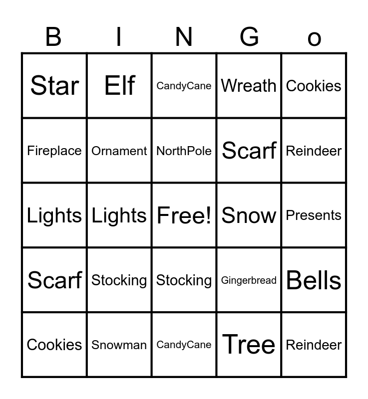 ⚠ This card has duplicate items: Santa (2), Reindeer (2), Snowflake (2), CandyCane (2), Stocking (2), Sleigh (2), Elf (2), HotCocoa (2), Fireplace (2), Snowman (2), Ornament (2), Wreath (2), Bells (2), Gingerbread (2), Presents (2), Holly (2), NorthPole (2), Snow (2), Mistletoe (2), Cookies (2), Lights (2), Tree (2), Star (2), Scarf (2), Jingle (2)