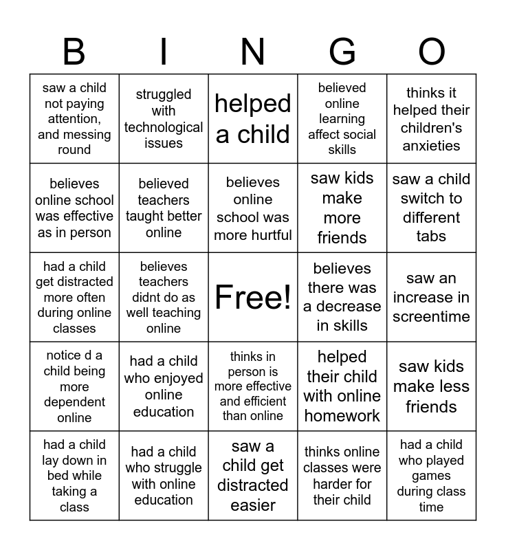 This bingo card has a free space and 24 words: had a child who enjoyed online education, had a child who struggle with online education, believes online school was more hurtful, had a child lay down in bed while taking a class, thinks it helped their children's anxieties, saw a child not paying attention, and messing round, believes online school was effective as in person, struggled with technological issues, believes there was a decrease in skills, thinks in person is more effective and efficient than online, saw kids make more friends, had a child get distracted more often during online classes, helped their child with online homework, saw kids make less friends, believed teachers taught better online, thinks online classes were harder for their child, saw an increase in screentime, helped a child, saw a child switch to different tabs, believes teachers didnt do as well teaching online, had a child who played games during class time, notice d a child being more dependent online, believed online learning affect social skills and saw a child get distracted easier.