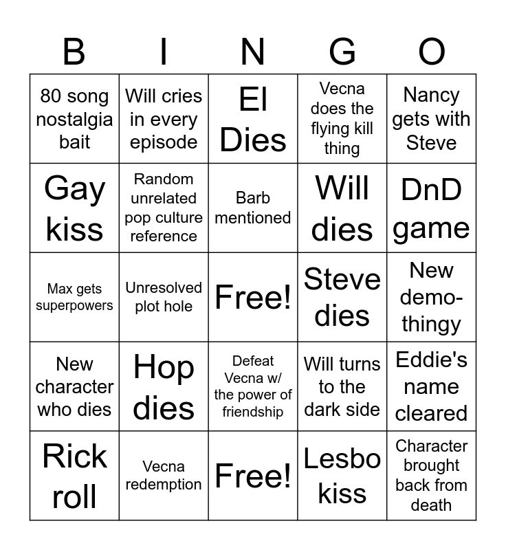 This bingo card has a free space and 24 words: Hop dies, Vecna redemption, Barb mentioned, Rick roll, Nancy gets with Steve, 80 song nostalgia bait, Gay kiss, Will cries in every episode, Steve dies, Defeat Vecna w/ the power of friendship, Will dies, Max gets superpowers, Will turns to the dark side, Eddie's name cleared, Random unrelated pop culture reference, Lesbo kiss, New demo-thingy, El Dies, DnD game, Unresolved plot hole, Character brought back from death, New character who dies, Vecna does the flying kill thing and Free!.
