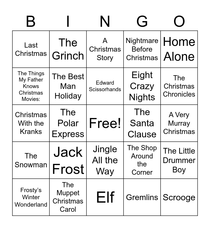 This bingo card has a free space and 44 words: Santa Claus Is Comin' to Town, Scrooge, The Year Without a Santa Clause, Frosty’s Winter Wonderland, Emmet Otter’s Jug-Band Christmas, Gremlins, A Christmas Story, National Lampoon's Christmas Vacation, Home Alone, The Muppet Christmas Carol, Nightmare Before Christmas, The Santa Clause, Jingle All the Way, Jack Frost, How the Grinch Stole Christmas, Elf, Love Actually, Christmas With the Kranks, Bad Santa, The Christmas Chronicles, The Grinch, A Boy Called Christmas, Noelle, Last Christmas, The Princess Switch, A Very Murray Christmas, Prancer, While You Were Sleeping, The Shop Around the Corner, The Snowman, Let It Snow, The Little Drummer Boy, Krampus, Spirited, The Polar Express, The Holiday, Four Christmases, Batman Returns, Edward Scissorhands, The Things My Father Knows Christmas Movies:, Eight Crazy Nights, The Preacher's Wife, The Best Man Holiday and A Christmas Prince.