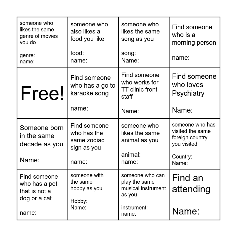 This bingo card has 16 words: someone with the same hobby as you Hobby: Name:, someone who has visited the same foreign country you visited Country: Name:, someone who likes the same song as you song: Name:, someone who likes the same genre of movies you do genre: name:, Someone born in the same decade as you Name:, someone who also likes a food you like food: name:, someone who likes the same animal as you animal: name:, someone who can play the same musical instrument as you instrument: name:, Free!, Find someone who has a go to karaoke song name:, Find someone who has a pet that is not a dog or a cat name:, Find someone who is a morning person name:, Find someone who has the same zodiac sign as you name:, Find someone who loves Psychiatry Name:, Find someone who works for TT clinic front staff Name: and Find an attending Name:.