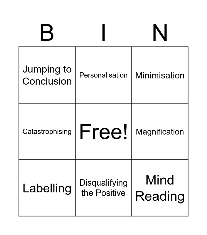 This bingo card has a free space and 13 words: Emotional Reasoning, Should Statements, Labelling, Personalisation, Catastrophising, Mind Reading, All-or-Nothing Thinking, Mental Filtering, Disqualifying the Positive, Jumping to Conclusion, Magnification, Minimisation and Over- Generalisation.