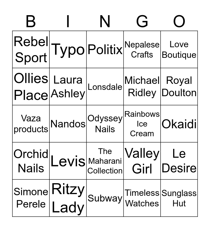 This bingo card has 38 words: FREE!, Katies, KFC, Laura Ashley, Le Desire, Levis, Lonsdale, Lotus Health Wealth, Love Boutique, Michael Ridley, Nandos, Nepalese Crafts, Odyssey Nails, Okaidi, Ollies Place, Orchid Nails, Ozmosis, Politix, Pumpkin Patch, Rainbows Ice Cream, Rebel Sport, Ritzy Lady, Royal Doulton, Simone Perele, Strandbags, Subway, Sunglass Hut, Sushi Sakura, T Bar, Temt, The Coffee Club, The Maharani Collection, Timeless Watches, Typo, Urban Sports, Valley Girl, Vaza products and Yes Optus Docklands.