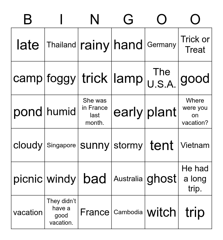 This bingo card has 36 words: Australia, bad, Cambodia, camp, cloudy, early, foggy, France, Germany, ghost, good, hand, He had a long trip., humid, lamp, late, picnic, plant, pond, rainy, She was in France last month., Singapore, stormy, sunny, tent, Thailand, The U.S.A., They didn’t have a good vacation., trick, Trick or Treat, trip, vacation, Vietnam, Where were you on vacation?, windy and witch.