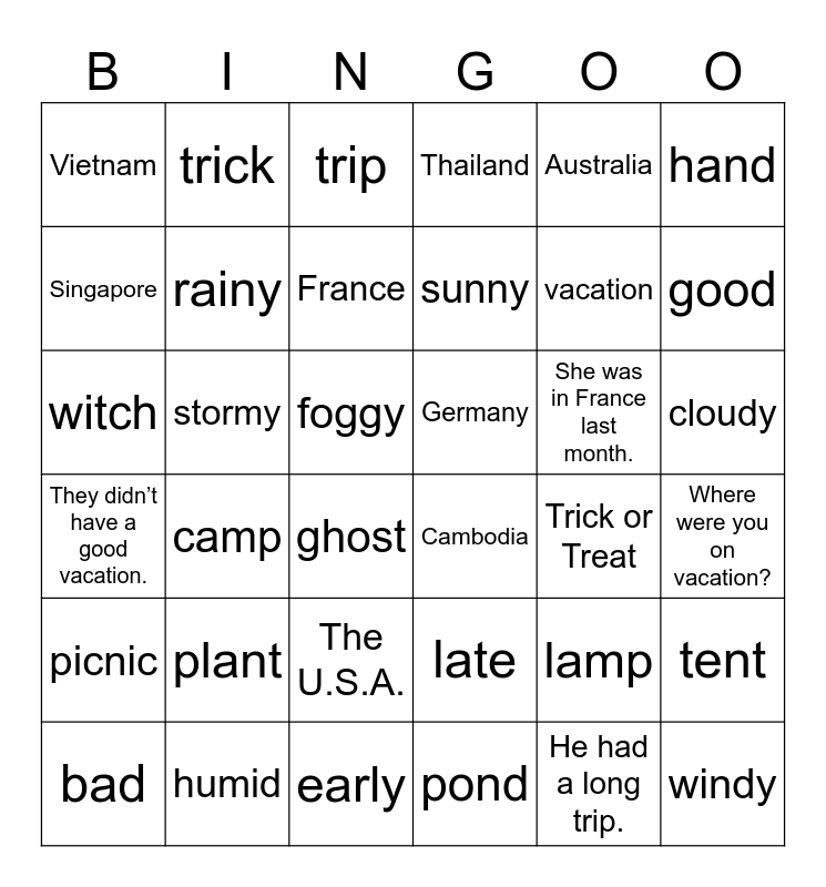 This bingo card has 36 words: late, The U.S.A., pond, Singapore, They didn’t have a good vacation., Germany, rainy, early, Australia, lamp, good, Thailand, tent, stormy, sunny, Vietnam, picnic, She was in France last month., witch, trip, foggy, camp, Cambodia, ghost, Trick or Treat, trick, vacation, humid, France, hand, windy, bad, Where were you on vacation?, cloudy, plant and He had a long trip..