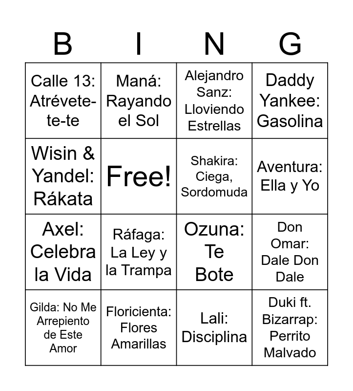 This bingo card has 51 words: Soda Stereo: De Música Ligera, Gilda: No Me Arrepiento de Este Amor, Ricky Martin: Livin' la Vida Loca, Bandana: Guapas, Fito Páez: Mariposa Tecknicolor, Los del Río: La Macarena, Maná: Rayando el Sol, La Mona Jiménez: El Federal, Free!, Los Palmeras: La Cobra, Shakira: Ciega, Sordomuda, Daddy Yankee: Gasolina, Shakira: Hips Don't Lie, Juanes: A Dios Le Pido, Juanes: La Camisa Negra, La Quinta Estación: El Sol No Regresa, Aventura: Ella y Yo, Floricienta: Flores Amarillas, Rodrigo: La Mano de Dios, Wisin & Yandel: Rákata, Don Omar: Dale Don Dale, Chayanne: Torero, Calle 13: Atrévete-te-te, Axel: Celebra la Vida, Reik: Noviembre Sin Ti, Daddy Yankee: Rompe, Ráfaga: La Ley y la Trampa, Luis Miguel: Cuando Calienta el Sol, Antonio Tarragó Ros: Sobredosis de Chamamé, Alejandro Sanz: Lloviendo Estrellas, Wisin & Yandel: Abusadora, Luis Fonsi ft. Daddy Yankee: Despacito, Farruko: Pepas, Don Omar ft. Lucenzo: Danza Kuduro, Karol G: Bichota, Bad Bunny: Titi Me Preguntó, Maluma: Hawái, Sebastián Yatra: Tacones Rojos, Bizarrap & Shakira: Music Sessions, Vol. 53, La Konga: Ya No Vuelvas, Lali: Disciplina, Duki ft. Bizarrap: Perrito Malvado, Tini & Emilia: Mi Fan, María Becerra: Automático, Quevedo: Bzrp Music Sessions, Vol. 52, Nicky Jam: El Amante, Ozuna: Te Bote, Karol G: Provenza, Abel Pintos: La Llave, Los Caligaris: Todos Locos and La Joaqui: Butakera.