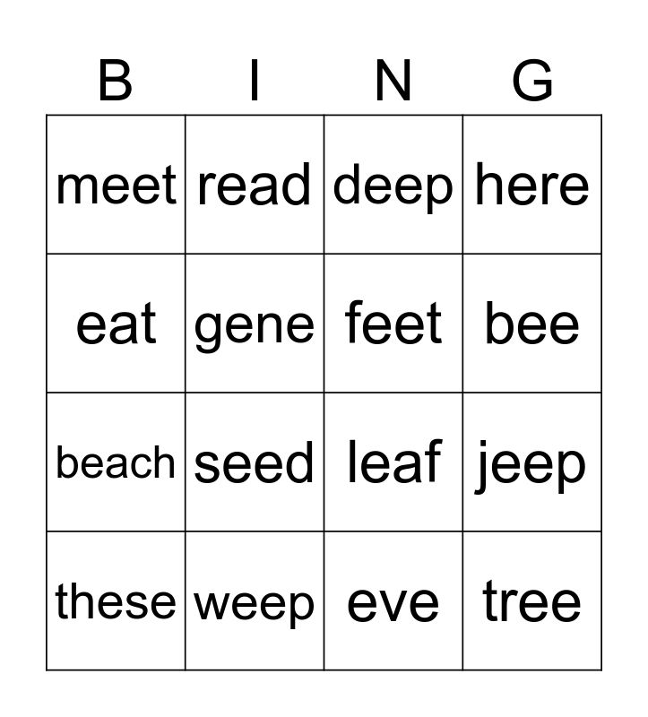 This bingo card has 16 words: weep, jeep, deep, meet, beach, read, leaf, eve, eat, gene, these, here, seed, bee, feet and tree.